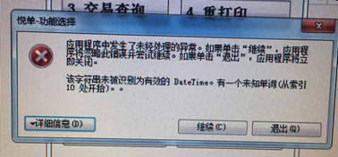 该错误为悦收银低版本未兼容系统时间格式导致,可以更改系统时间格式(百度即可),建议安装最新版本悦收银,是兼容时间格式的。