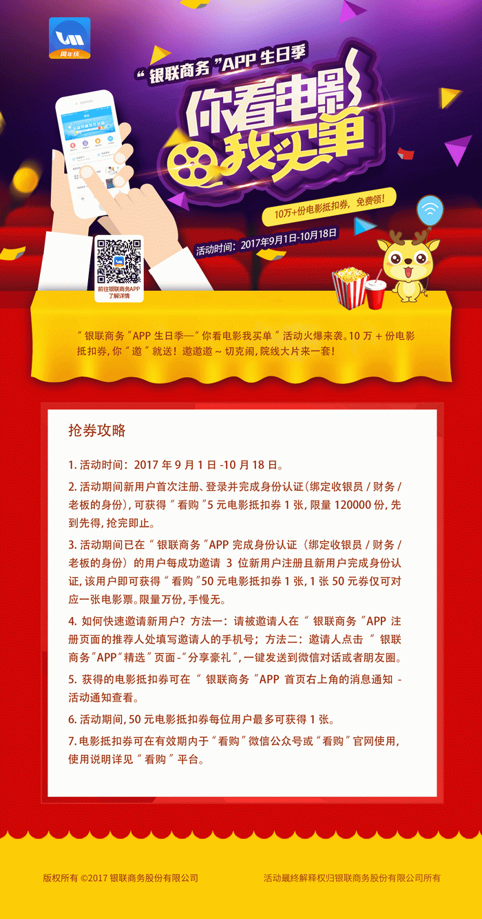 银联商务APP生日季,超过10万份免费电影观影券等您来领!活动详情如下: