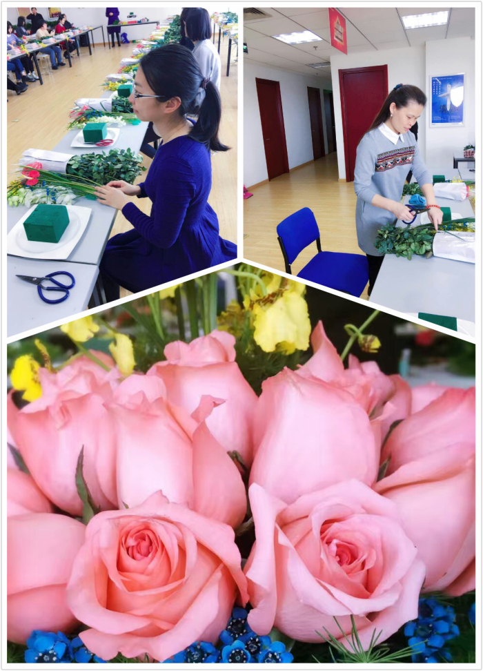 本次活动公司工会特地聘请了专业的插花老师,并且挑选了可容纳60余人的专用场地。插花所用的容器,花材和主题,都是由老师精心挑选,以配合妇女节的节日气氛。本次老师特意为我司准备的插花主题为“花开富贵”,顾名思义,寄托了对于美好生活的祝愿。所用的花材包括:粉玫瑰——寓意青春美丽;杨兰——寓意雍容华贵;文心兰——寓意快乐无忧;蓝色腊梅——寓意傲雪凌霜;红掌——寓意大展宏图,最后缀以蓬莱松,寓意健康长寿。大家跟着老师的步骤,从固定容器,处理花泥,到整理花材,塑造整体形态,每一步都是创意的激发和美的表达。