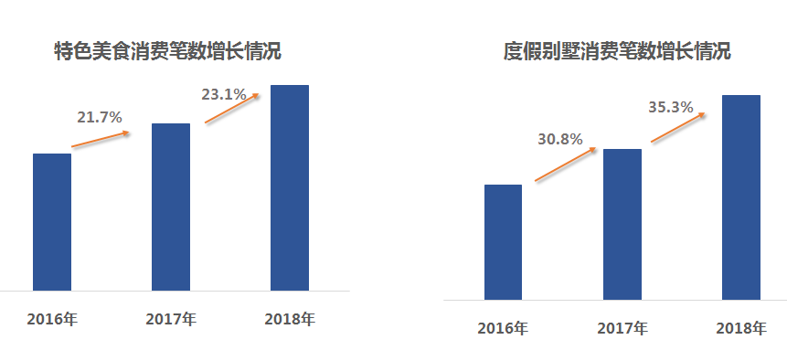 随着都市休闲客群快速崛起,旅游消费进一步升级。报告显示,近三年来,游客在目的地“舌尖美食”的消费笔数年增长率超20%,在度假别墅的消费笔数年增长率超30%。
