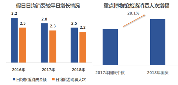 数据显示,假日旅游日均消费金额及消费人次均超过平日的2倍以上。随着国家对文化旅游的大力推进,假日期间丰富多彩的各类文化展览吸引大量游客参与。2018年国庆,重点博物馆消费人次同比增长达28.1%。