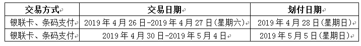 2019年4月26日至2019年4月27日的交易资金,于4月28日划付;2019年4月30日至2019年5月4日的交易资金,于2019年5月5日合并划付。