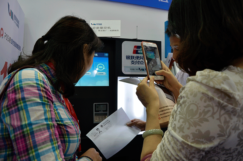 笔者经常有这样的尴尬,在外出办事途中临时需要复印身份证或打印一份文档资料,走遍大街小巷才能找到一家复印社;在政府部门的服务大厅,也常常会出现这种急需复印身份件或文件的紧急情况。现在一台自助式复印机就能使这类问题迎刃而解。银联商务展台上的这台自助终端,不仅仅能自助复印,而且还有自助支付功能,真正实现了从支付到复印一条龙的自助模式。