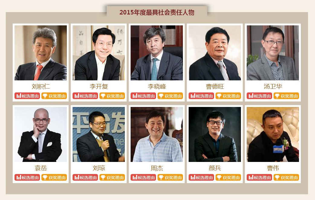 《互联网周刊》2015年度人物以“诚”的本质作为评价原则,以各行各业的共性与特性作为认知和解析角度,以普世的精神和信念作为基本价值尺度,最终评选出100位身处在当下互联网风暴中心的企业家。这些企业家身持续秉承着强大的企业愿景,植根于最具根本性的企业和社会责任,诚于内而信于外,以一个企业家、一个公民的良知、责任,为社会、行业树立了知行的榜样。