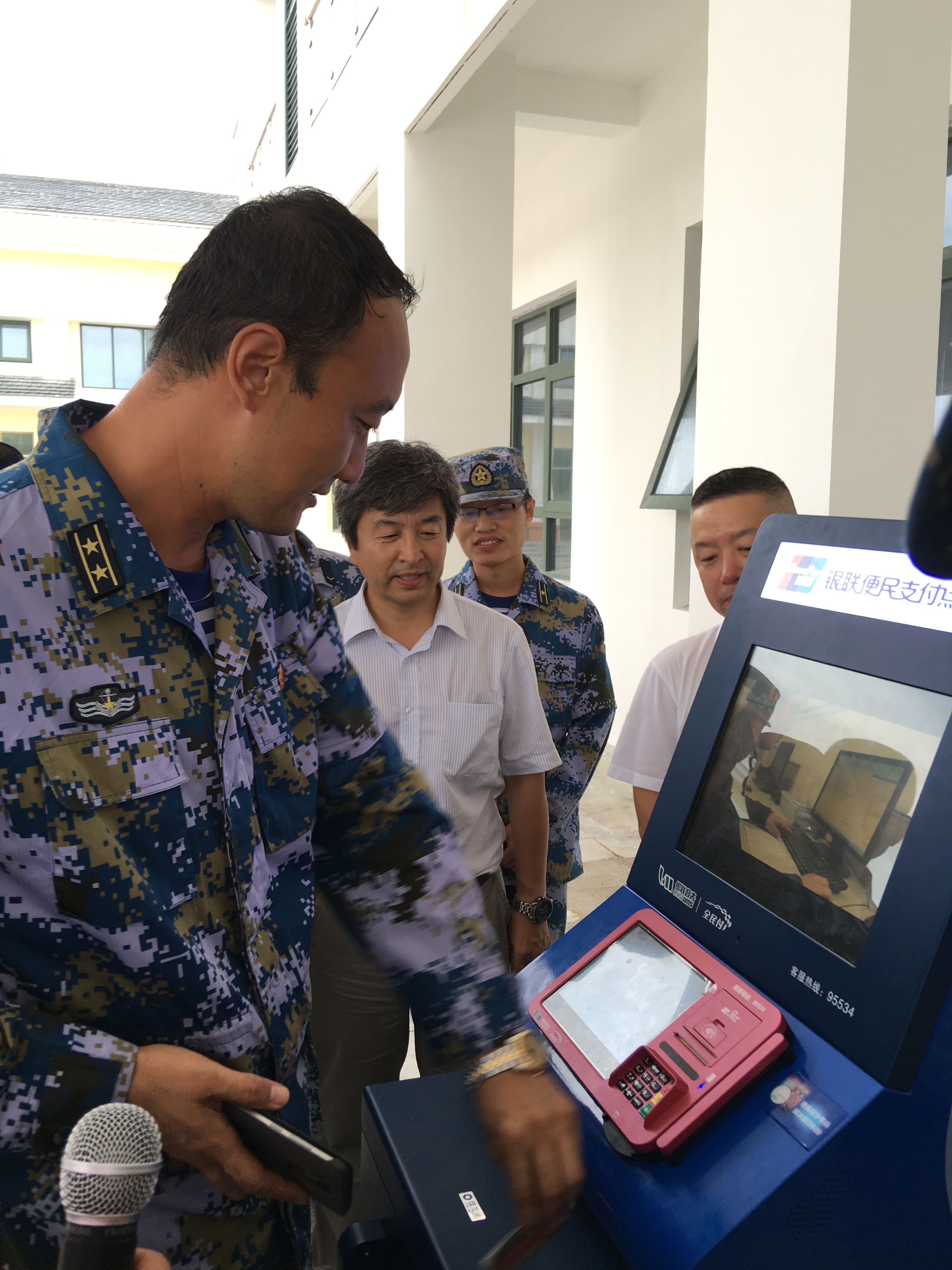 9月5日,祖国最南端城市三沙市永兴岛某驻岛军营迎来了一位特殊的“战士”,国内领先的综合支付服务机构银联商务总裁李晓峰,率领业务骨干小分队,披波斩浪赴岛为军营布放和开通了“全民付助军威金融自助终端”,并与部队签署军民共建协议书,捐赠电动车等日常所需物资,为驻岛官兵们提供小额取现、转账汇款、手机充值等基础金融服务以及日常的岛内便利出行。银联商务此举不仅将金融自助终端服务网络进一步延伸到了南疆戍边军营,也成为祖国南疆边陲拥军共建的又一个典范。