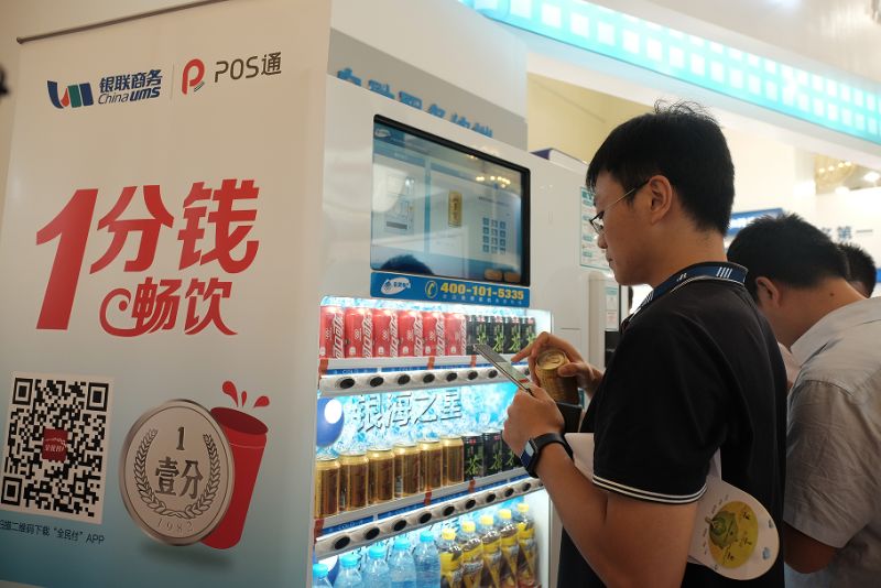还没凑近,远远就能看到银联商务的展台门口挤满了举着手机扫码的参展观众,原来这里正在举办“POS通1分钱畅饮”活动。观众现场手机扫描二维码,下载并注册“全民付”APP后,使用APP中的“POS通”,“挥”一下就能实现秒付,只需1分钱就能在自助售货机上购买一瓶饮料;观众还可以选择在POS机上挥手机,1分钱同样可以买到心仪的小礼品,零距离感受手机近场支付的炫酷购物体验。