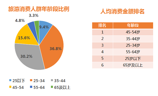 旅游消费人群中,年龄段在25-34岁的消费人数最多,45-54岁的人均消费最高。