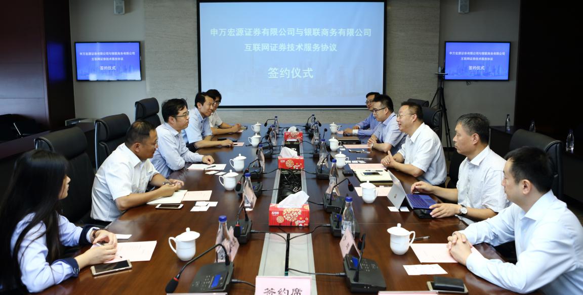 7月6日,银联商务与申万宏源证券有限公司(以下简称“申万宏源”)在上海举行了战略合作协议签约仪式。公司副总裁张靖文、申万宏源总经理助理张克均及双方相关部门业务负责人参加了本次签约仪式。