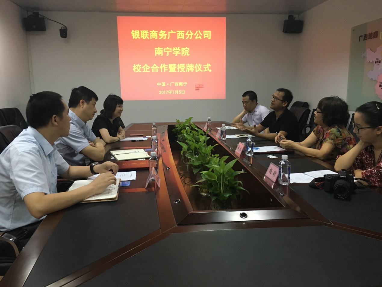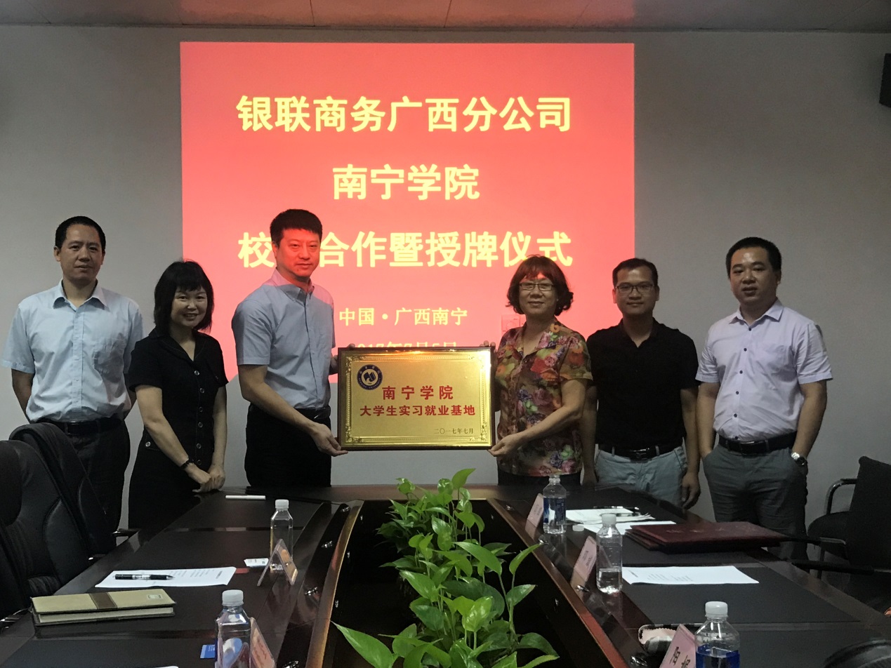7月5日上午,银联商务广西分公司与南宁学院校企合作暨授牌仪式在分公司举行,标志着南宁学院在分公司正式挂牌建立大学生实习就业基地。分公司负责人、副总经理戴坚、综合部总经理黄卉萌、市场部助理总经理黄毓东及南宁学院信息工程学院院长阳妮、书记兼副院长邓斌、综合科副科长杨莉、就业指导老师闫辉参加了仪式。