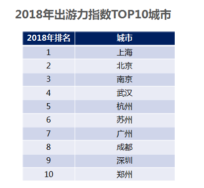 从区域分布来看,出游力指数仍呈现东南沿海地区较高、西北地区较低的局面,但中西部地区出游力指数与东部地区差距有所缩小。2018年全国城市居民出游力指数排名前十位的城市依次是上海、北京、南京、武汉、杭州、苏州、广州、成都、深圳、郑州。(数据说明:城市出游力指数是指该城市居民旅游消费支出占该城市居民消费总支出的比重)