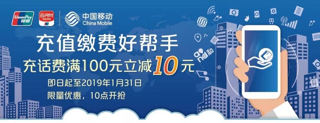 用户登录中国移动APP通过云闪付APP为本手机号充值,可享受满100元立减10元优惠。