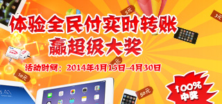 凡通过“全民付”手机客户端进行一笔实时转账交易,即可获得一张抽奖必中券(100%中奖)。转账笔数和金额不受限制。