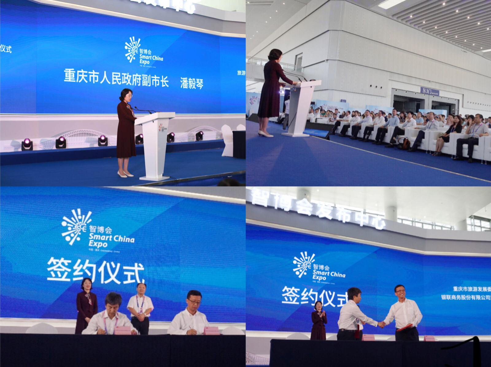 8月24日,首届中国国际智能产业博览会组委会在主会场中央大厅,举办了银联商务与重庆市旅发委战略合作现场签约仪式。在重庆市潘毅琴副市长、500余名观展嘉宾、30多家新闻媒体的现场见证下,李晓峰总裁、刘旗主任分别代表银联商务股份有限公司和重庆市旅游发展委员会签署战略合作协议。