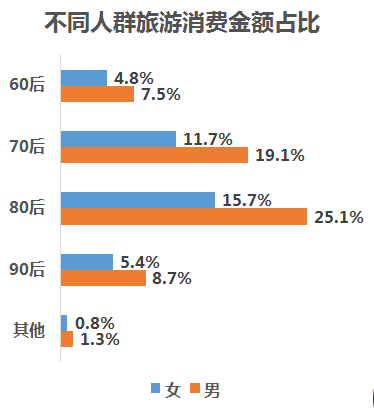 报告显示,旅游消费人群中,买单男性多于女性,70后及80后人群为主力消费人群,90后人群数量快速增长。从旅游消费金额来看,80后男性旅游消费贡献最高,占比超25%。