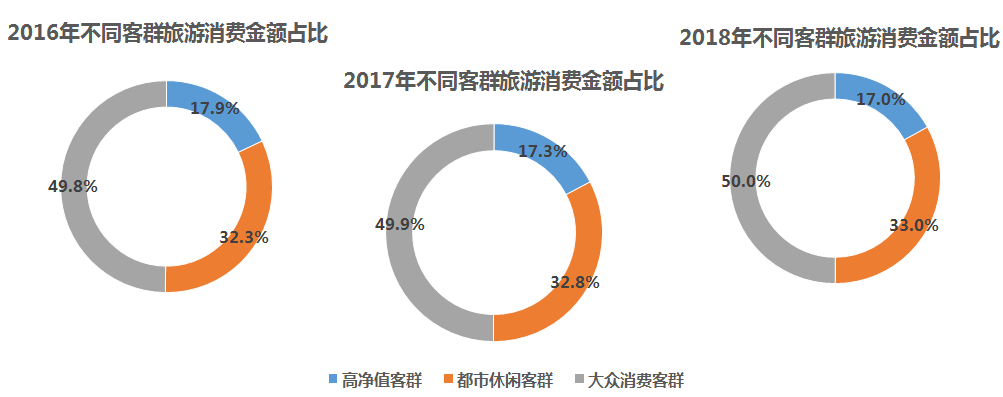 数据显示,从2016至2018年,都市休闲客群旅游人数增长迅速,预计至2020年占比将达到36.9%;高净值客群数量也有提升,预计至2020年占比将达到10.4%。从三类客群对消费总金额的贡献度看,大众消费客群贡献近50%的旅游消费金额;都市休闲客群随人数快速增长,旅游消费金额贡献度增长较慢,旅游消费潜力待进一步挖掘。